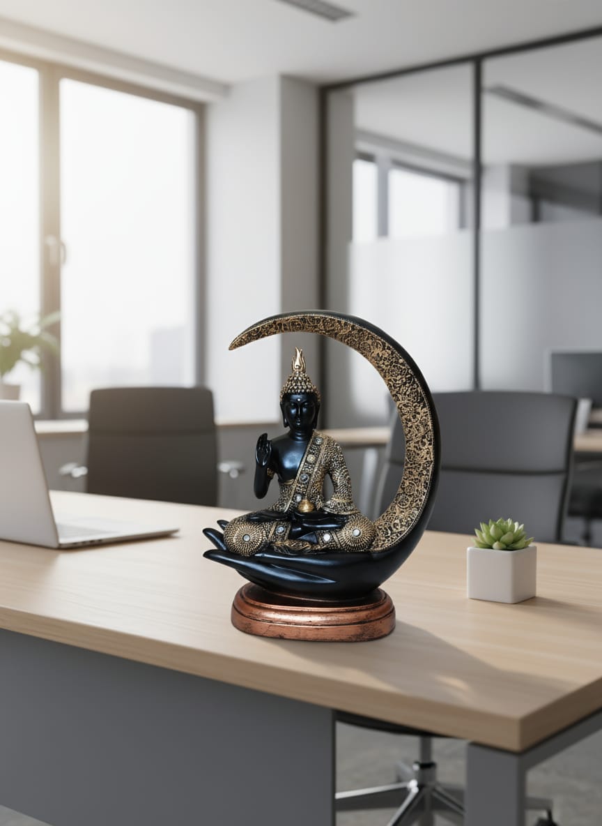 Bring the divine blessings of Lord Ram into your home with this stunning devotional statue. The figure, often revered as the embodiment of Dharma (righteousness), stands gracefully within a beautifully carved black prabhavali (arch). The black finish symbolizes strength and stability, perfectly highlighting the deity's face, crown, and ornaments, which are richly adorned with vibrant gold, yellow, and red accents. The base is inscribed with the sacred chant, "जय श्री राम" (Jai Shri Ram), making it a powerful focal point for your puja room, office, or meditation space.